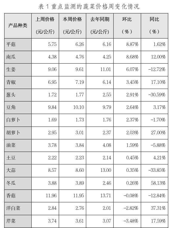 本周重点监测的27种蔬菜平均价格为5.28元/公斤,比上周下跌2.94%,同比下跌1.68%。 其中环比涨幅前五的品种是平菇、南瓜、生姜、青椒和葱头;环比跌幅前五的品种是生菜、莴笋、西葫芦、大葱和西红柿(详见表1)。