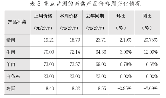 本周重点监测的5种畜禽产品中,牛肉和羊肉价格比上周分别上涨3.06%、0.78%;猪肉和鸡蛋价格比上周分别下跌2.19%、0.95%;白条鸡价格与上周持平(详见表3)。