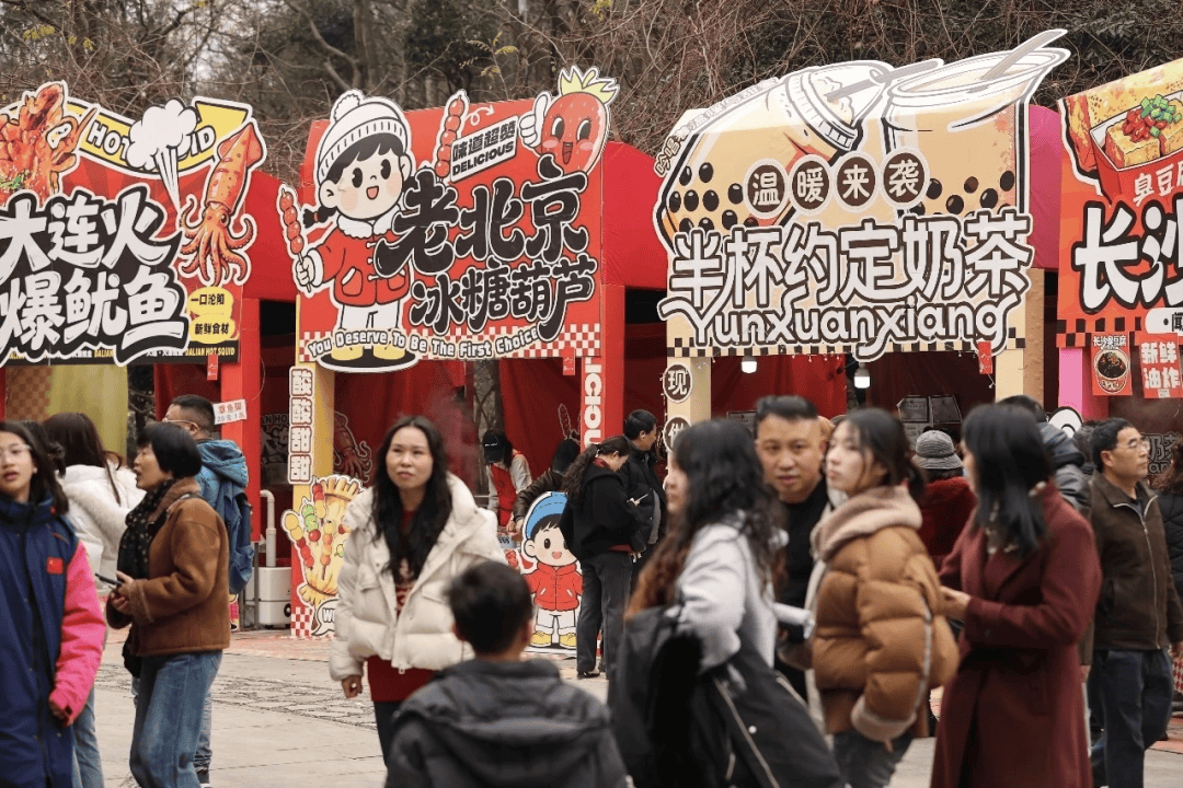 公园主干道上,“新春嘉年华”市集热闹开张。糖画摊前,老师傅手腕轻转,一只金色的马便跃然板上;糍粑摊边,热气腾腾的木槌声伴着吆喝声,游客们排队等着尝一口软糯的“年味”。登高归来的人们三五成群,或逛集市,或品美食,或只是在长椅上晒太阳,享受新春假日的闲适。